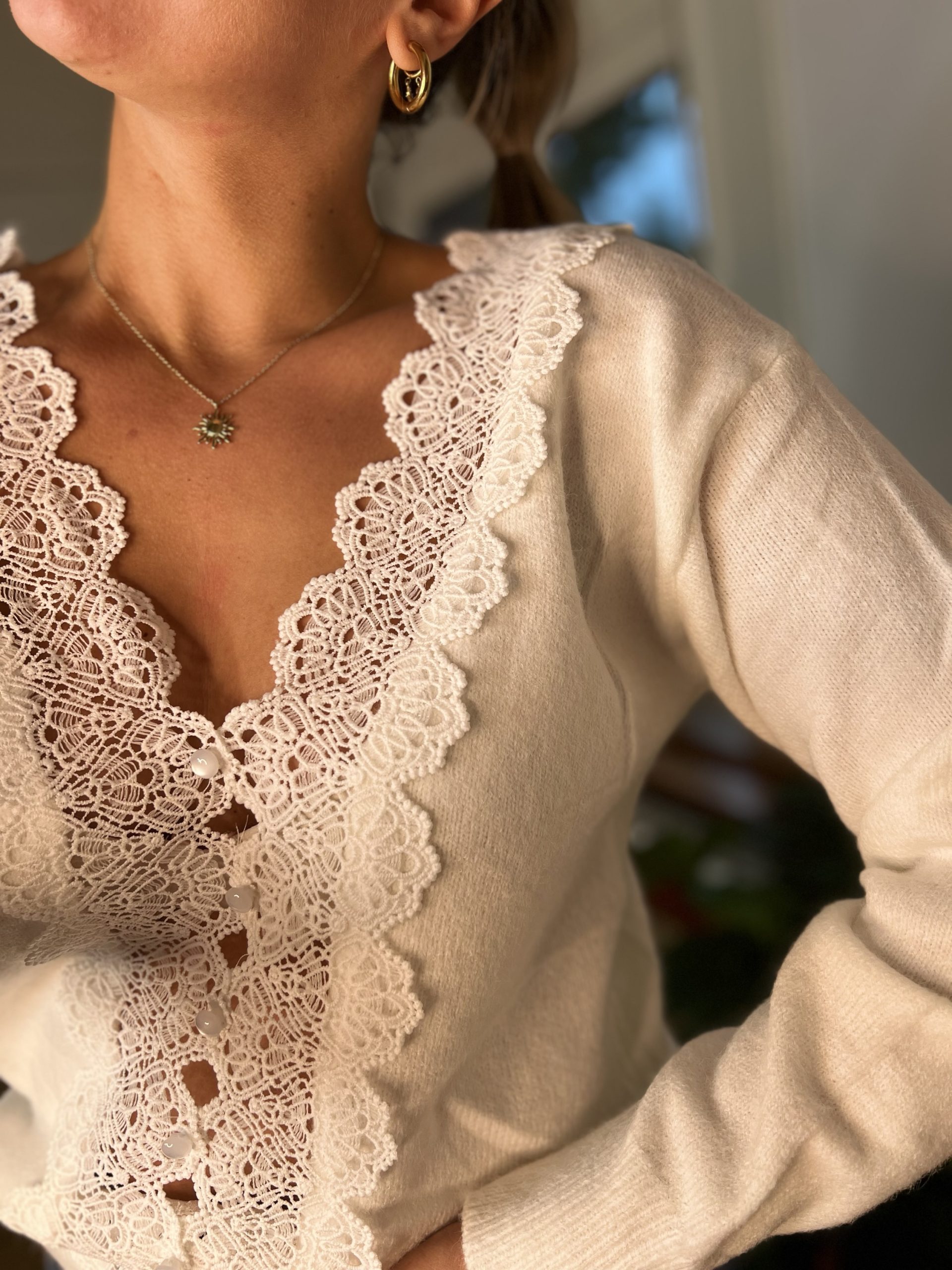 Le Gilet Chloé est un sublime gilet blanc, doté d’une très belle dentelle sur le devant du gilet. Il peut se porter dans les 2 sens 🙂