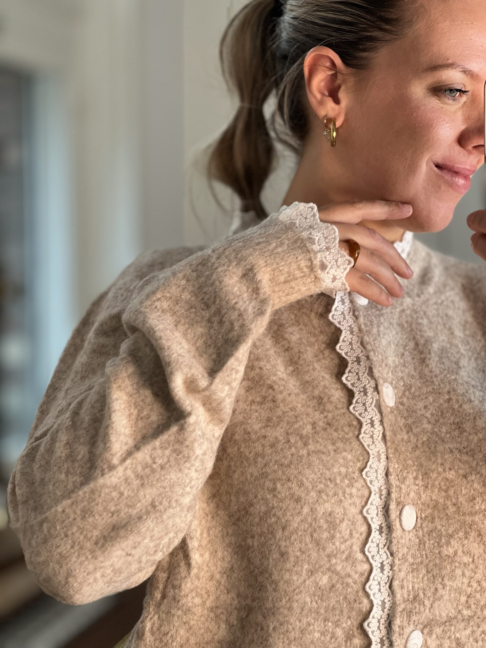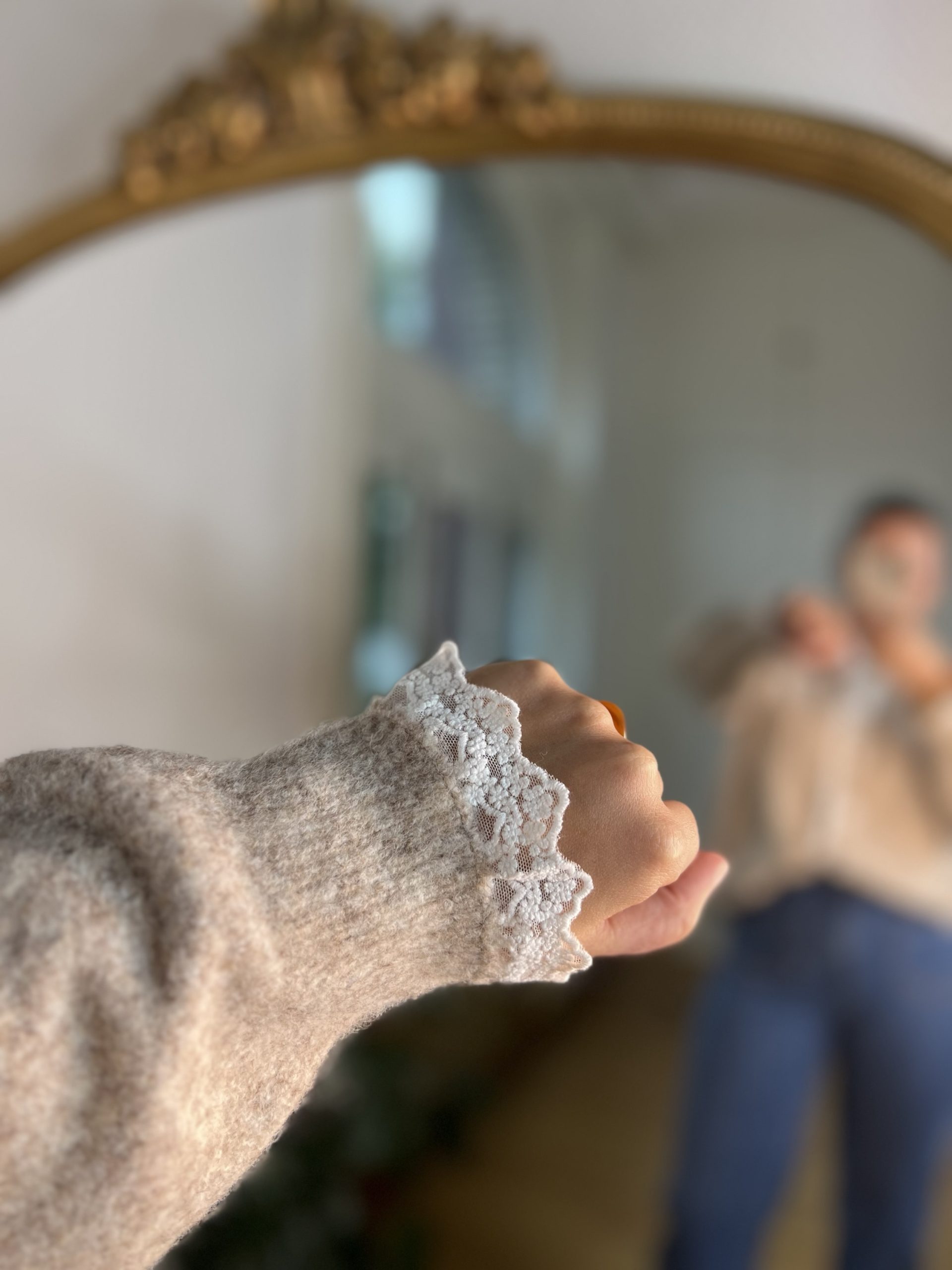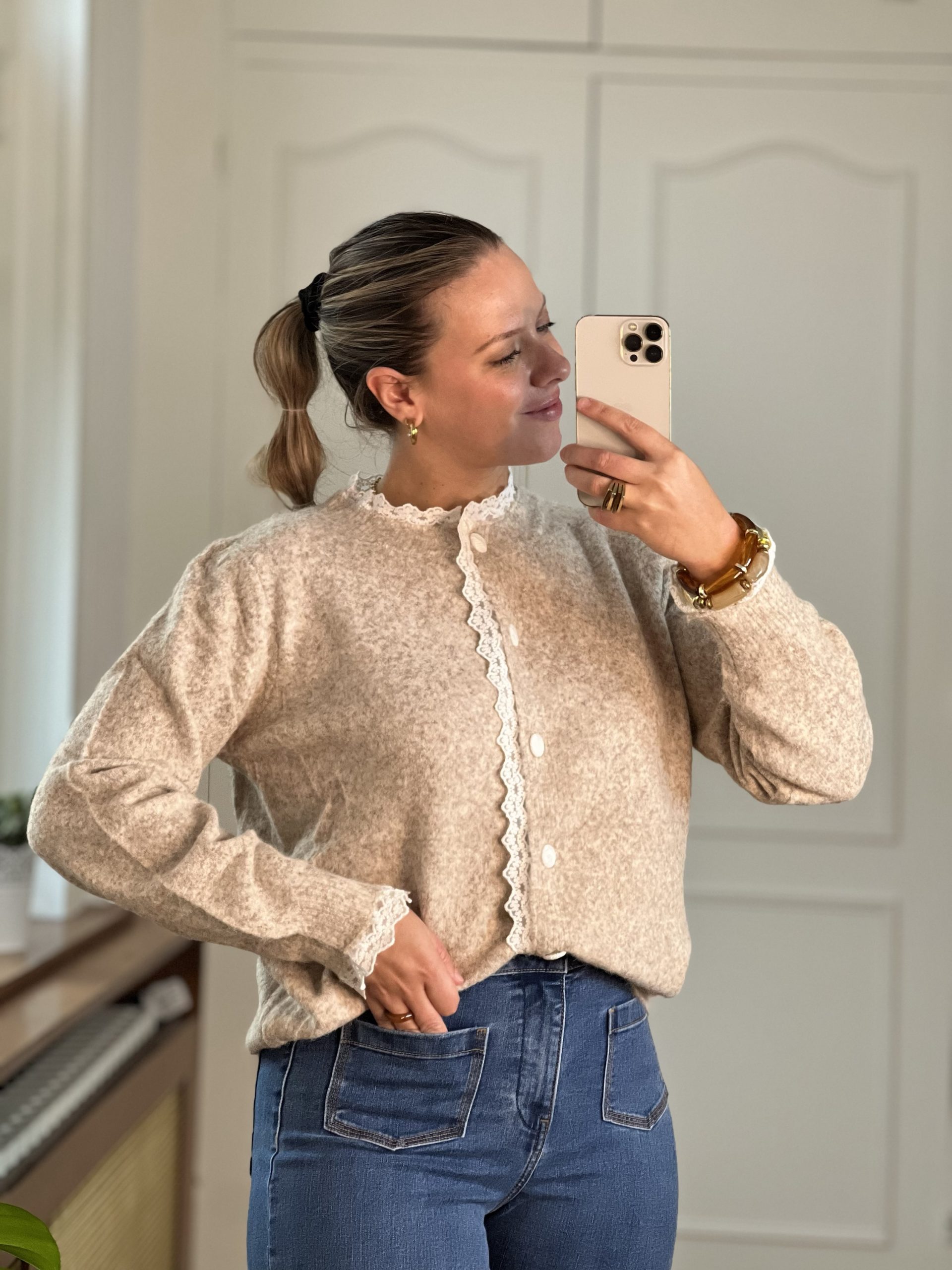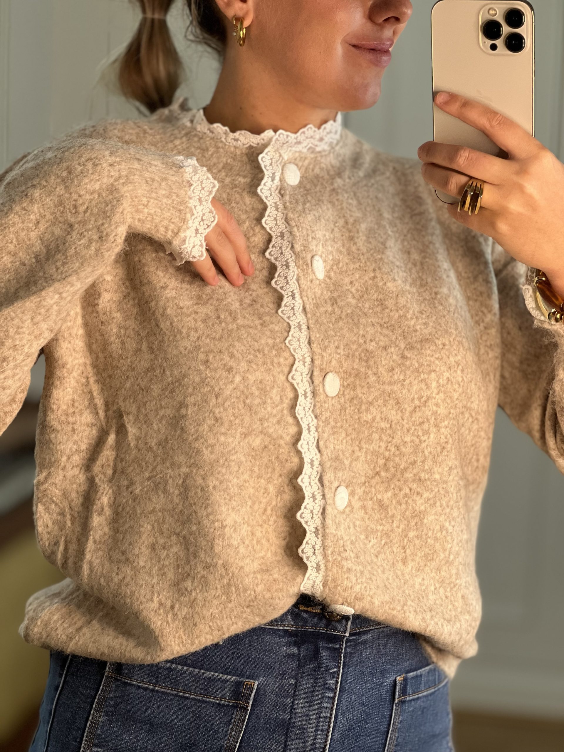 Le Gilet Lily est d’une douceuuuur incroyable. Coupe assez large, c’est un vrai gilet cocooning, élégant avec sa dentelle sur le col et les manches.