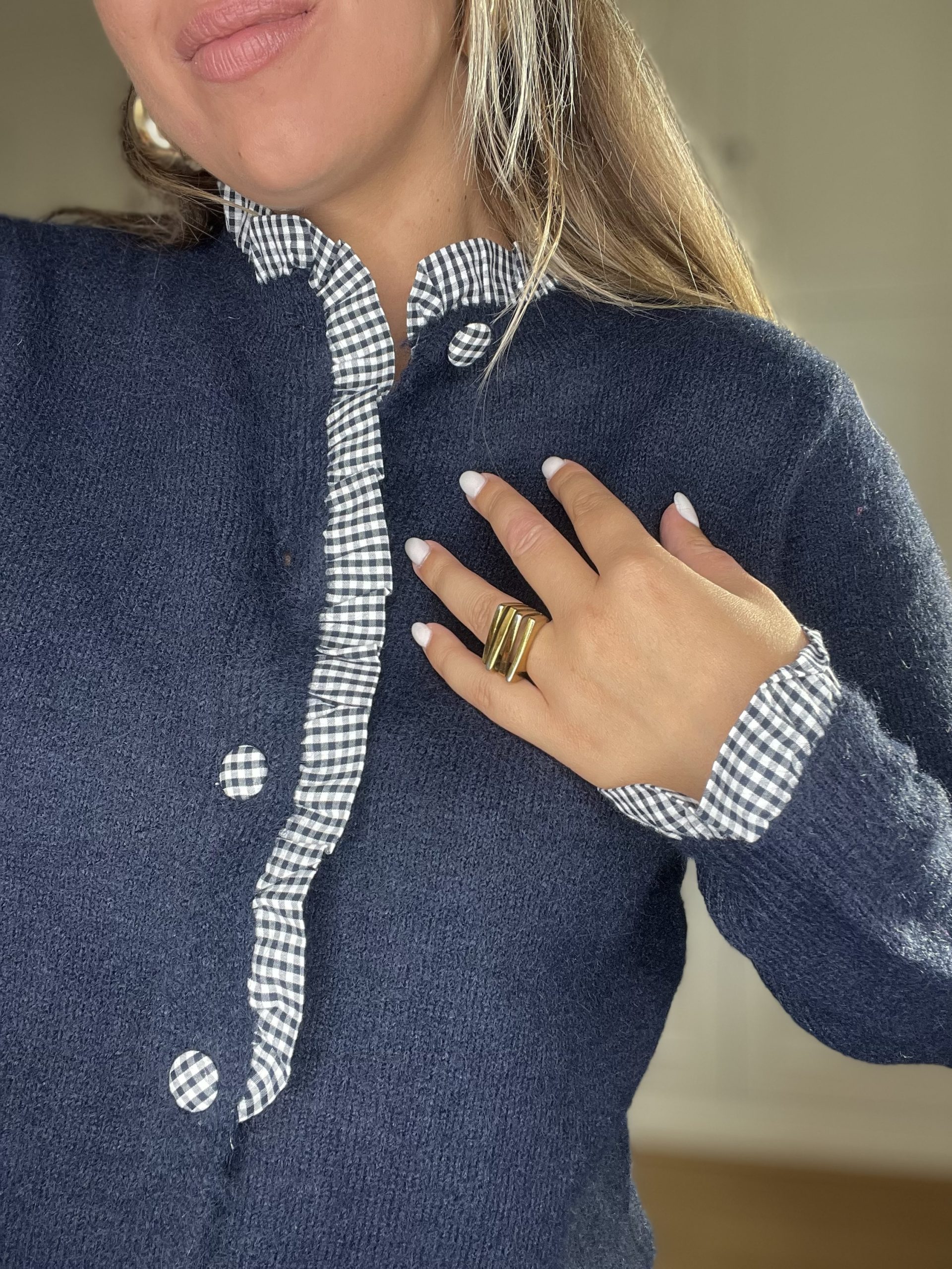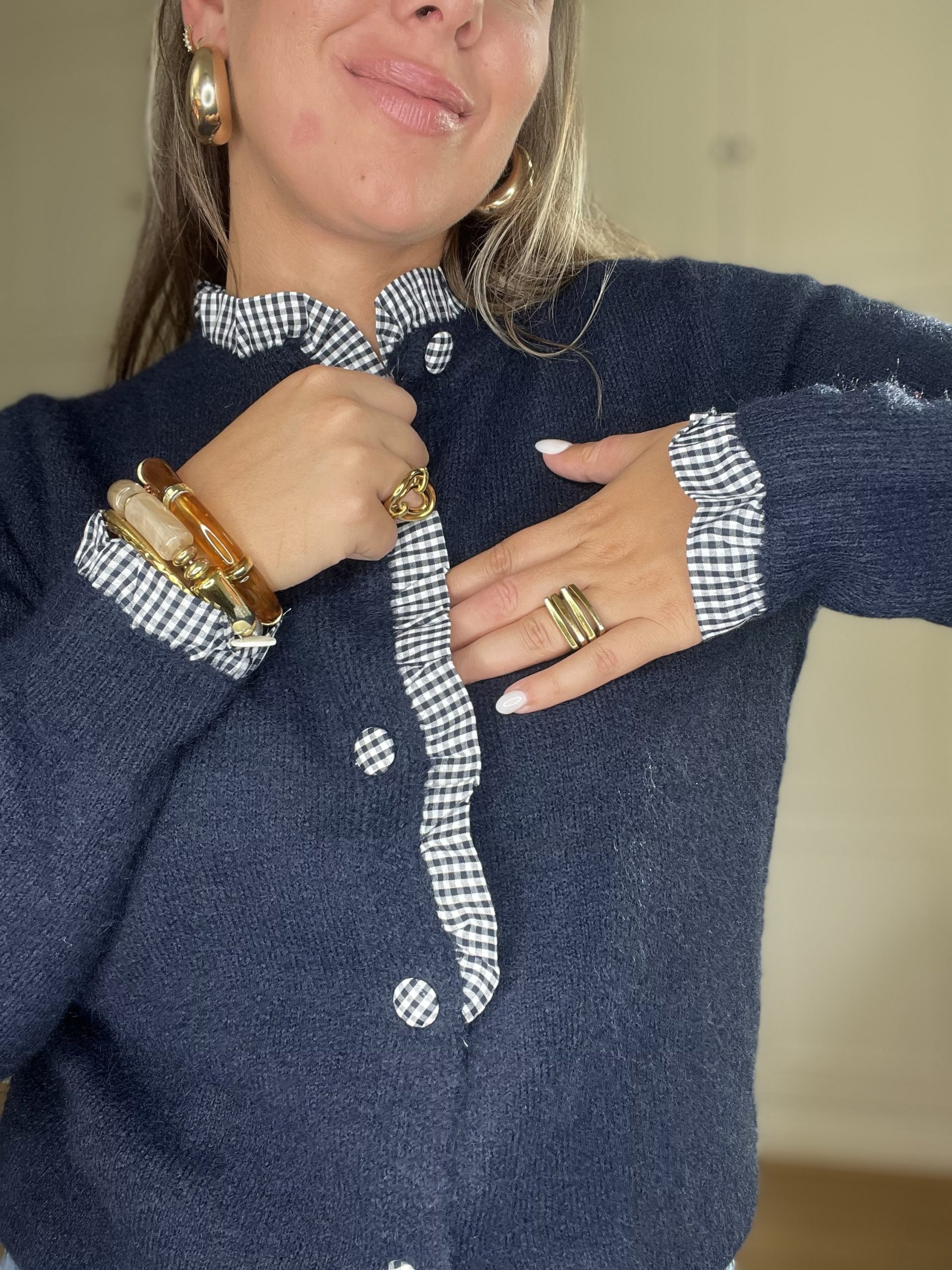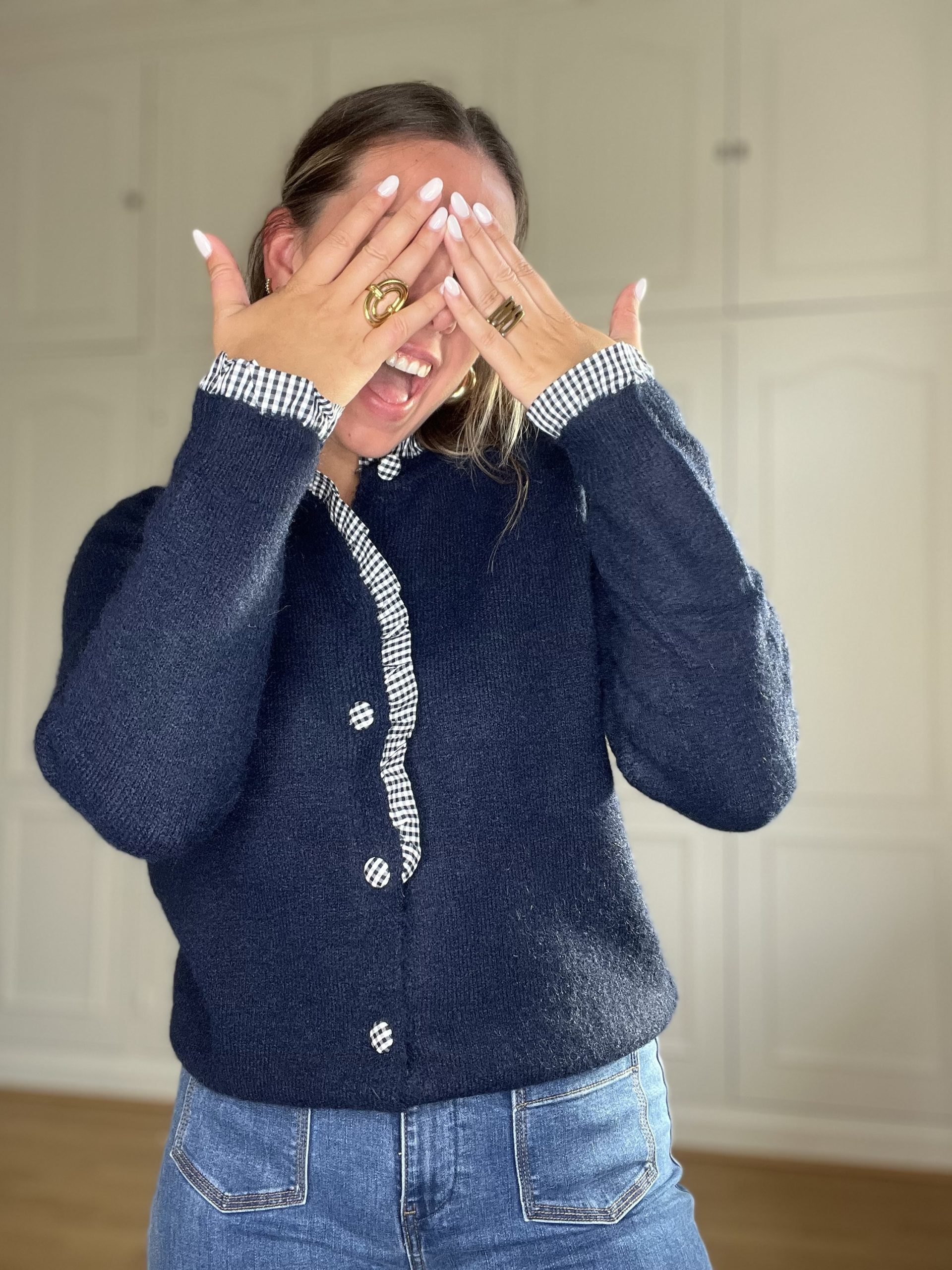 Le premier gilet de la saison c’est le gilet Lucie, un joli gilet bleu marine avec des petit détails Vichy !