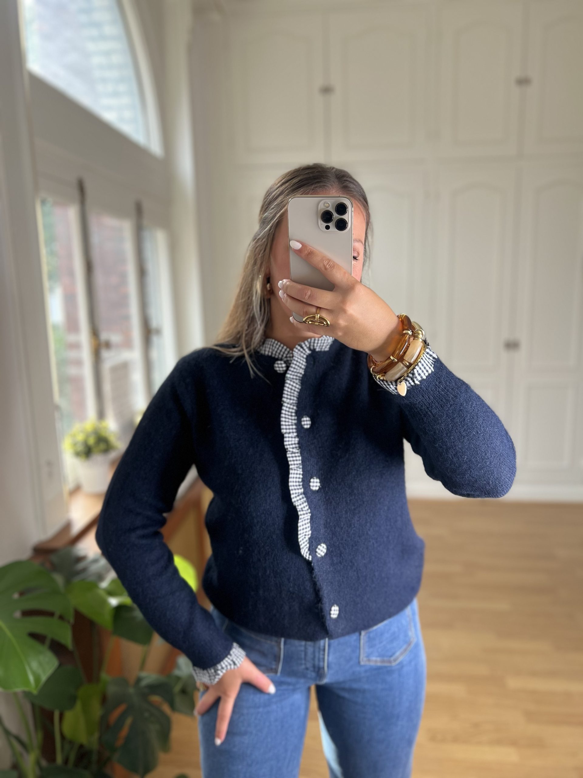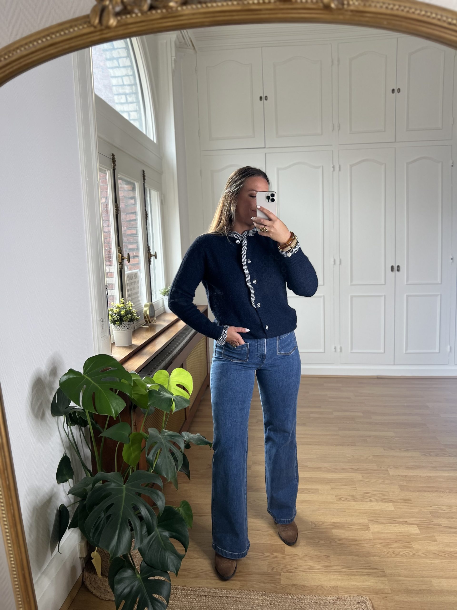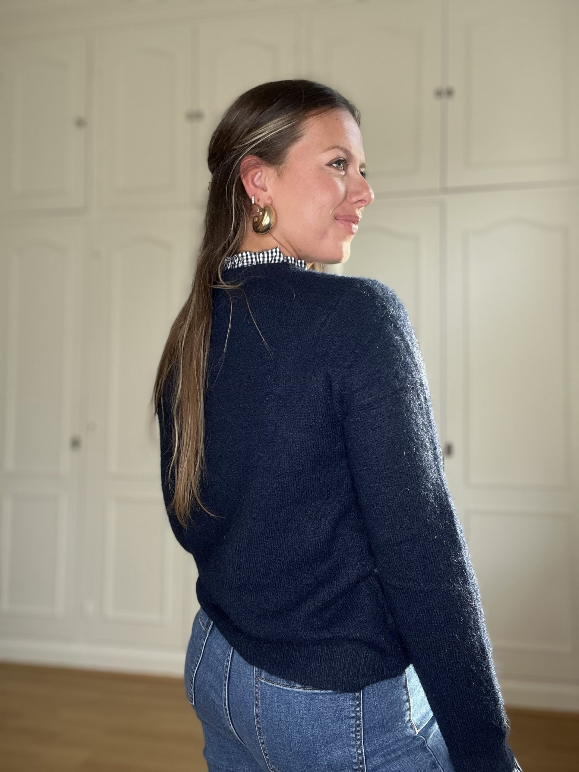 Le premier gilet de la saison c’est le gilet Lucie, un joli gilet bleu marine avec des petit détails Vichy !