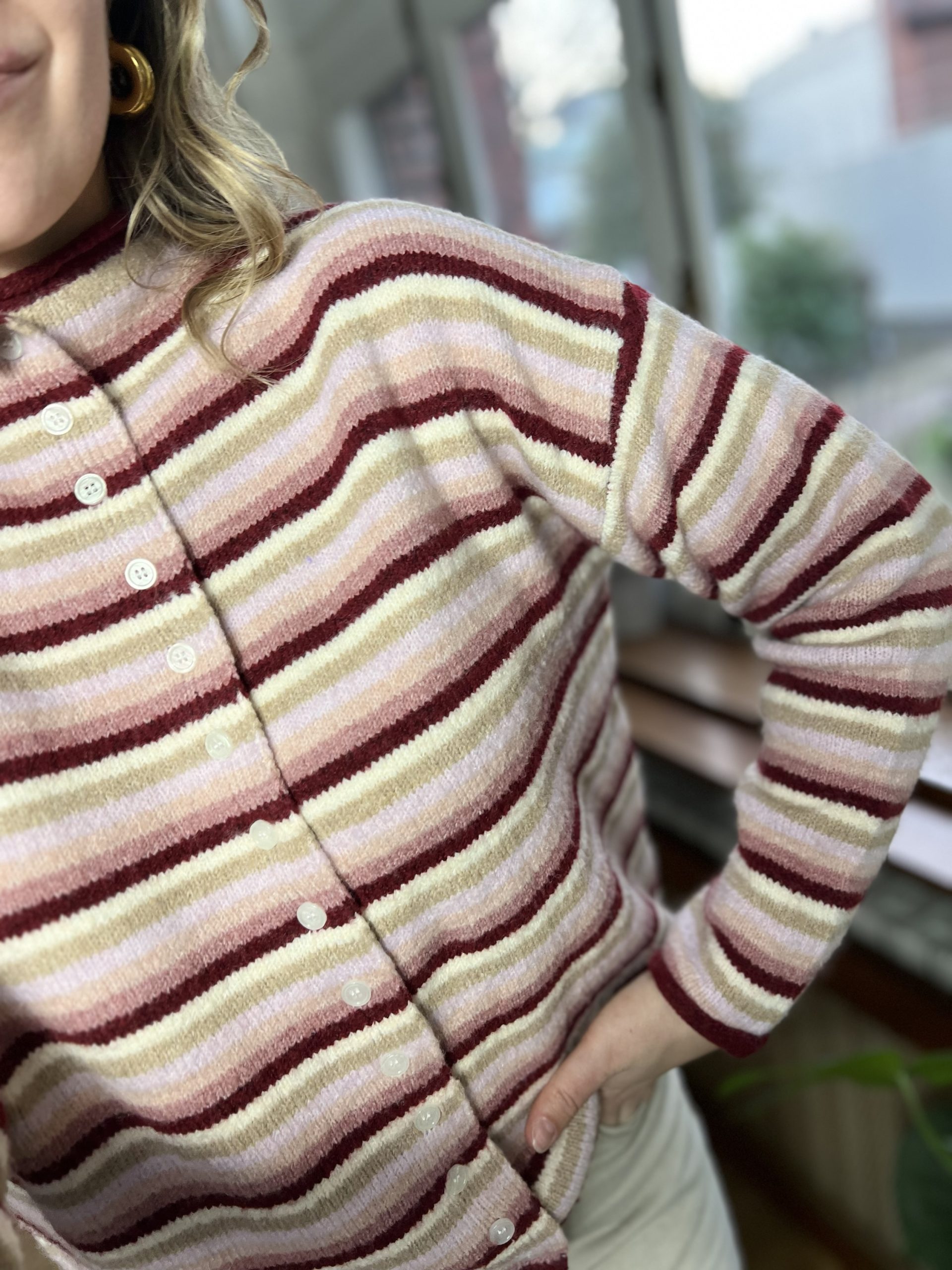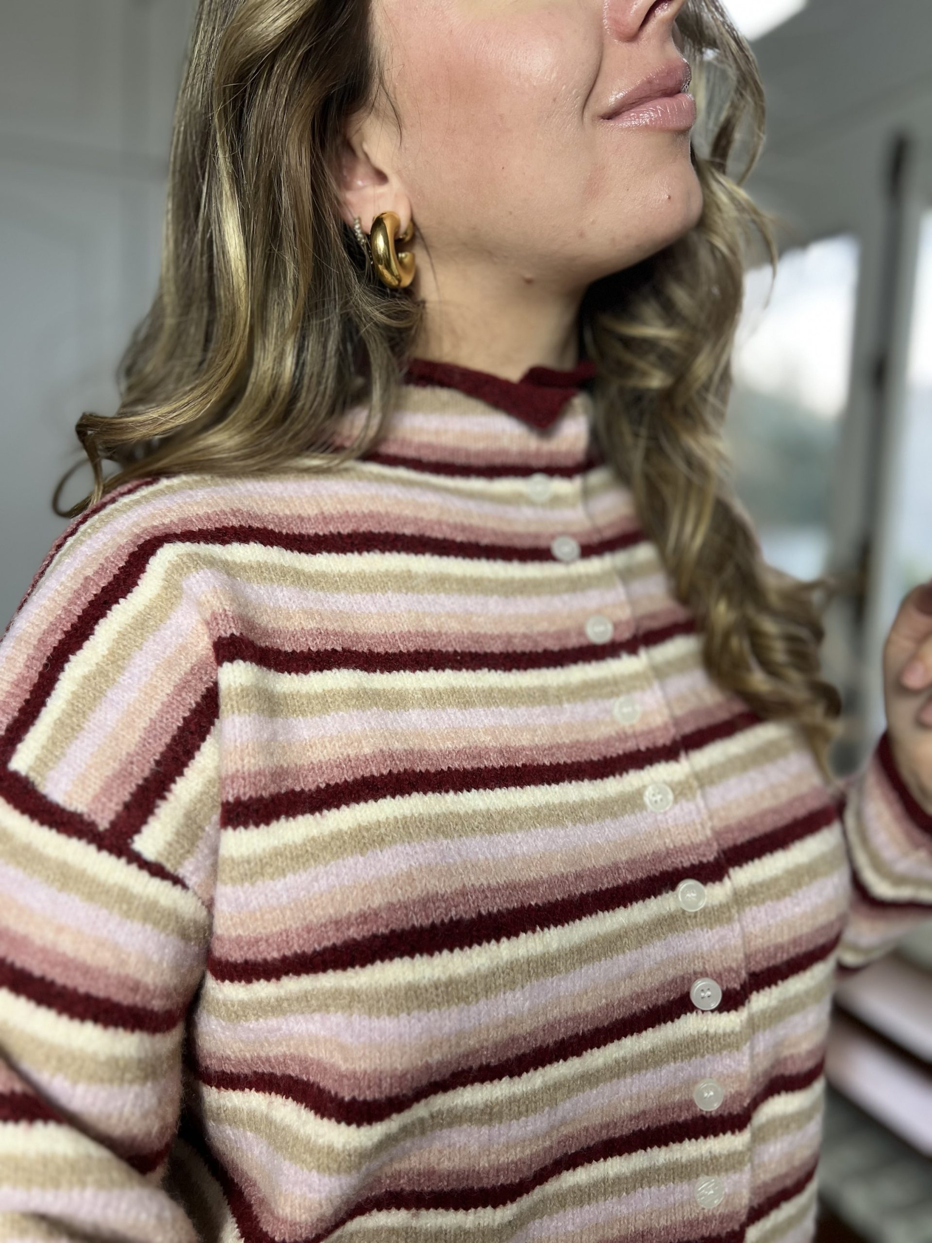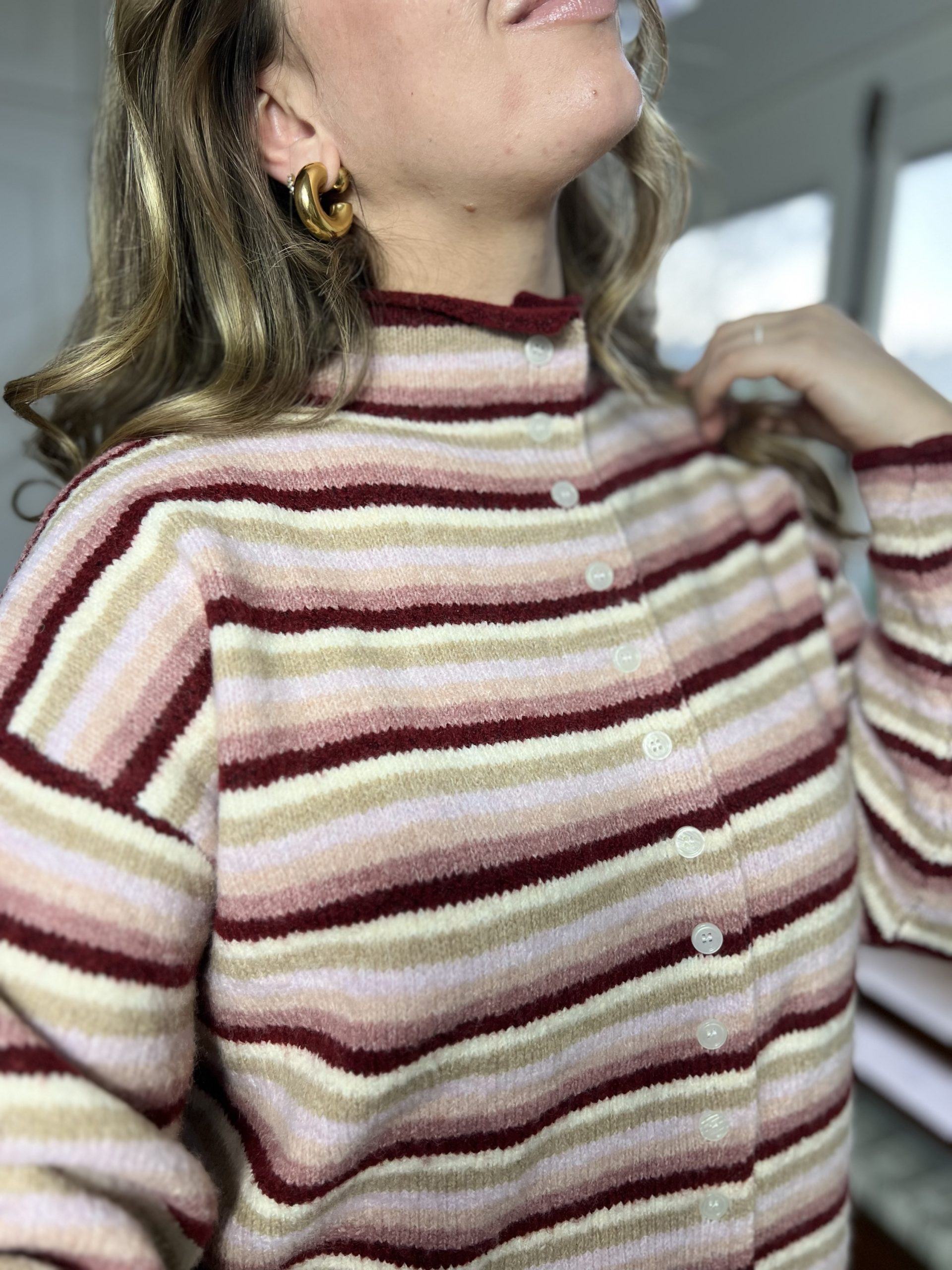 Le pull Alizée est un pull rayé tout doux, avec des tons roses et un col montant