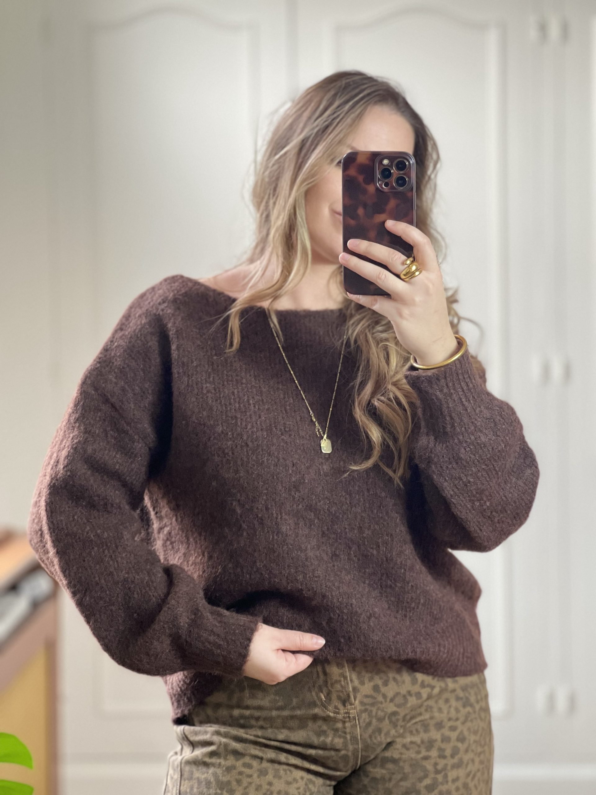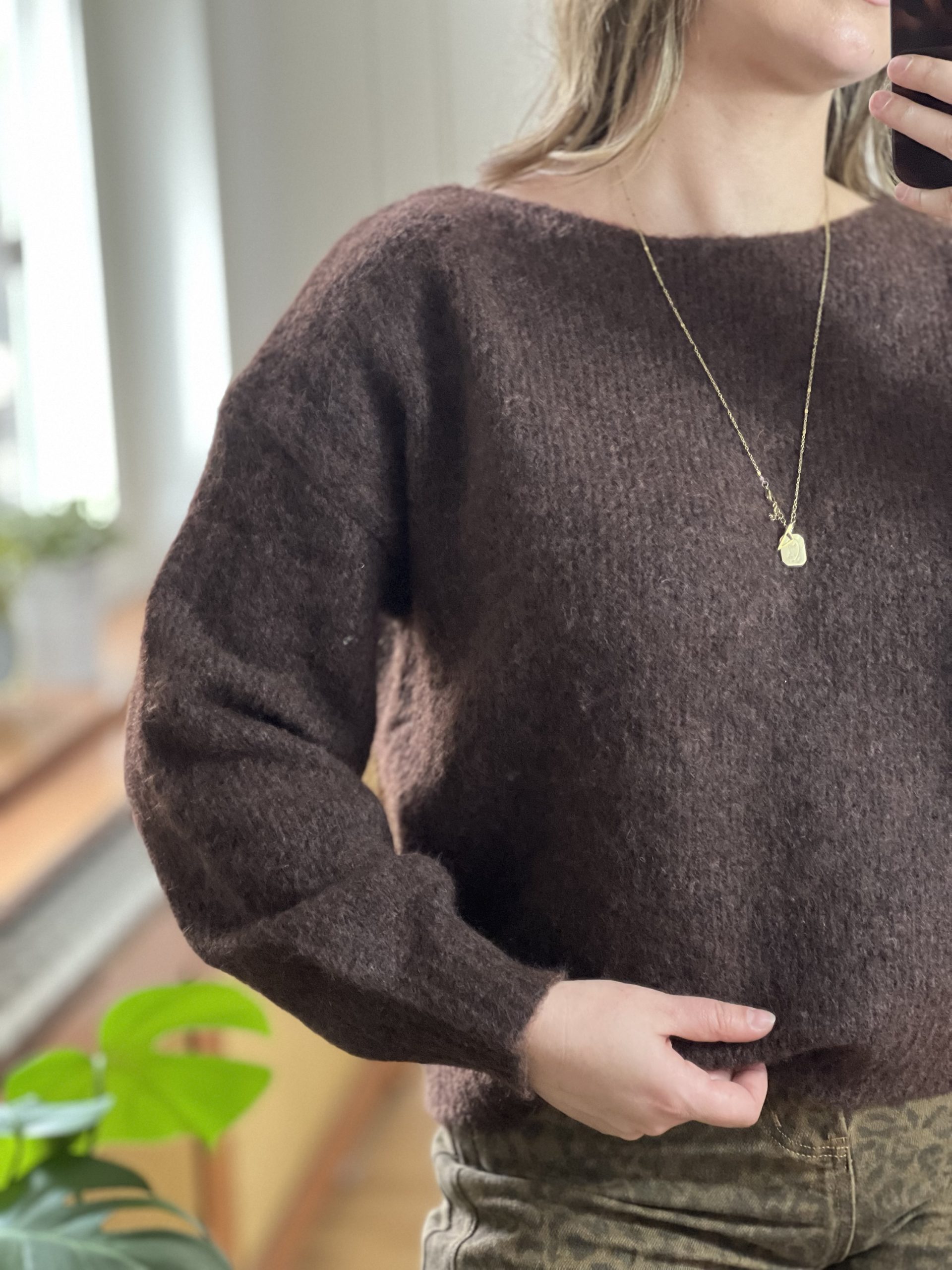 Le pull Auguste est un pull marron, avec des manches légèrement ballons et un col bateau, ce qui le rend très chic et élégant.