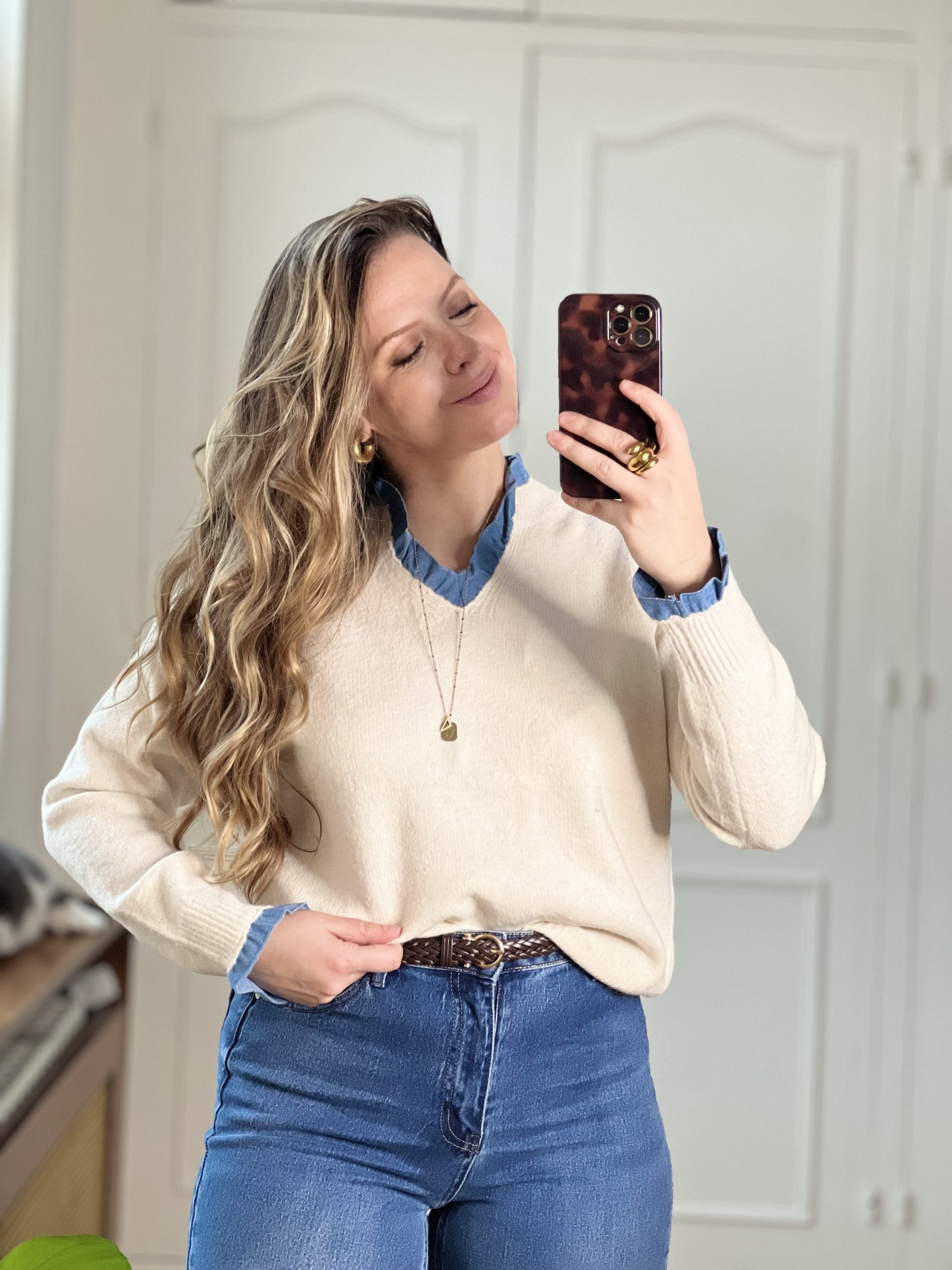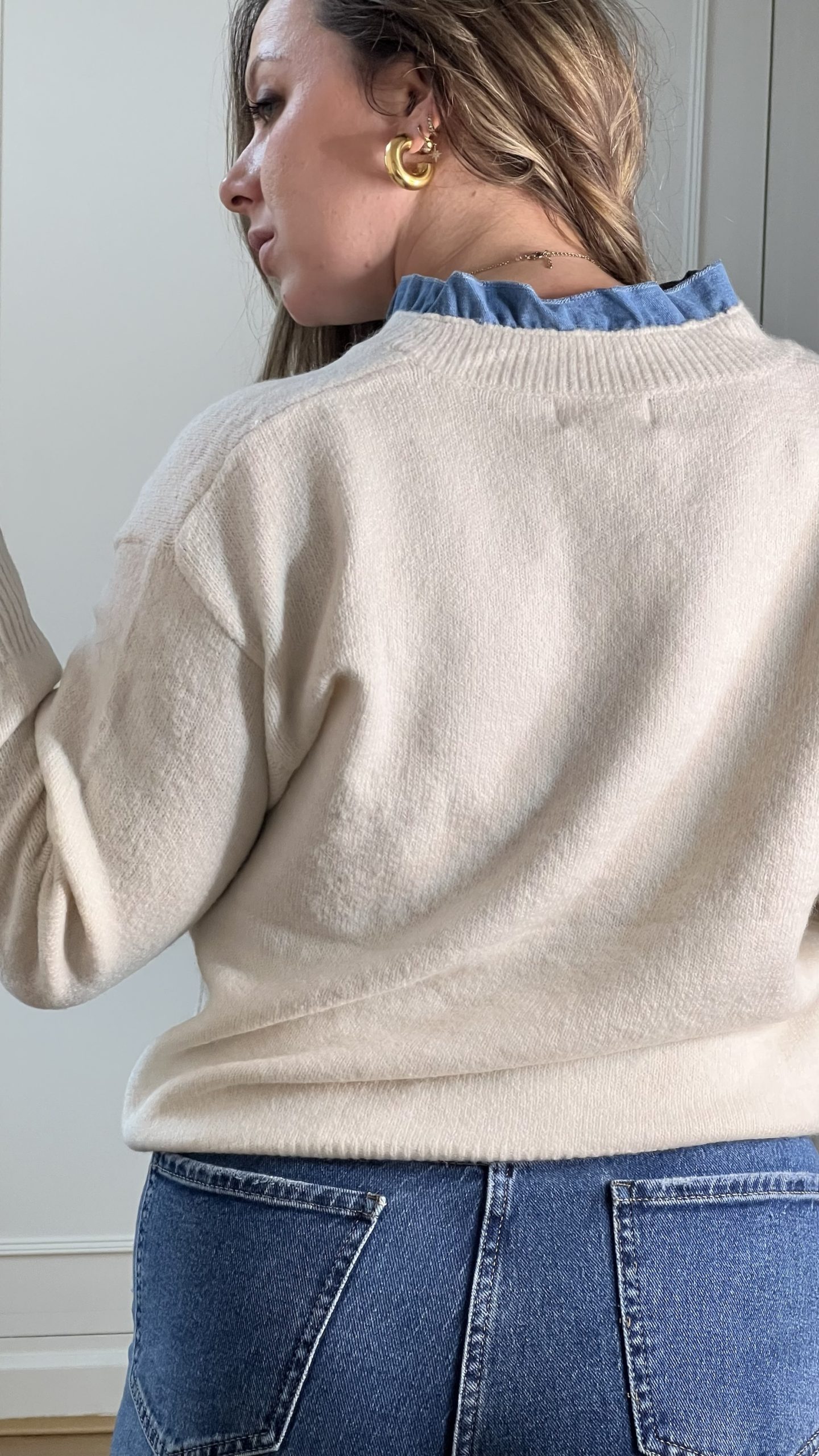 Le pull Lola est un pull beige / avec un col et des manchettes effet jean qui dépassent,