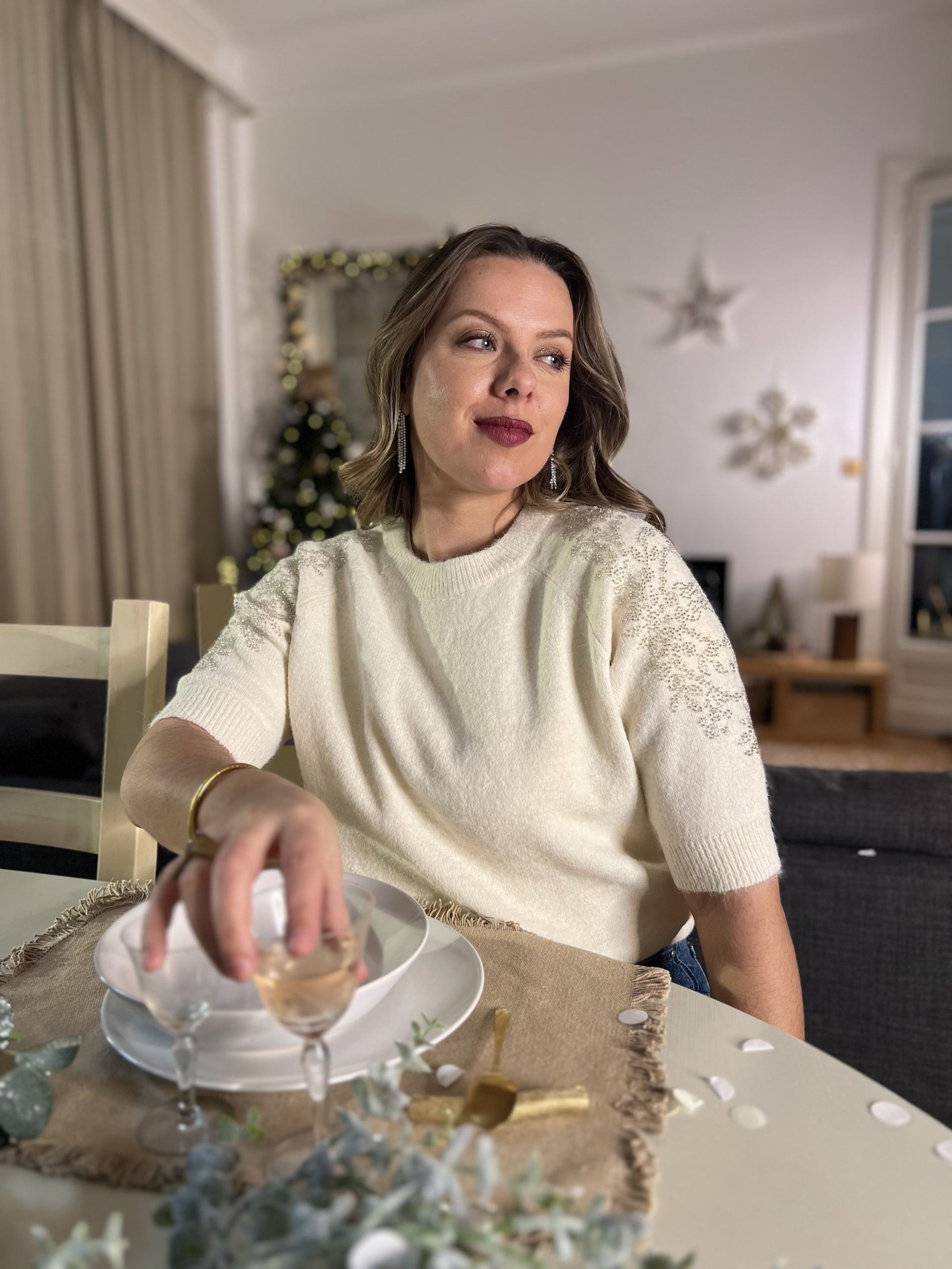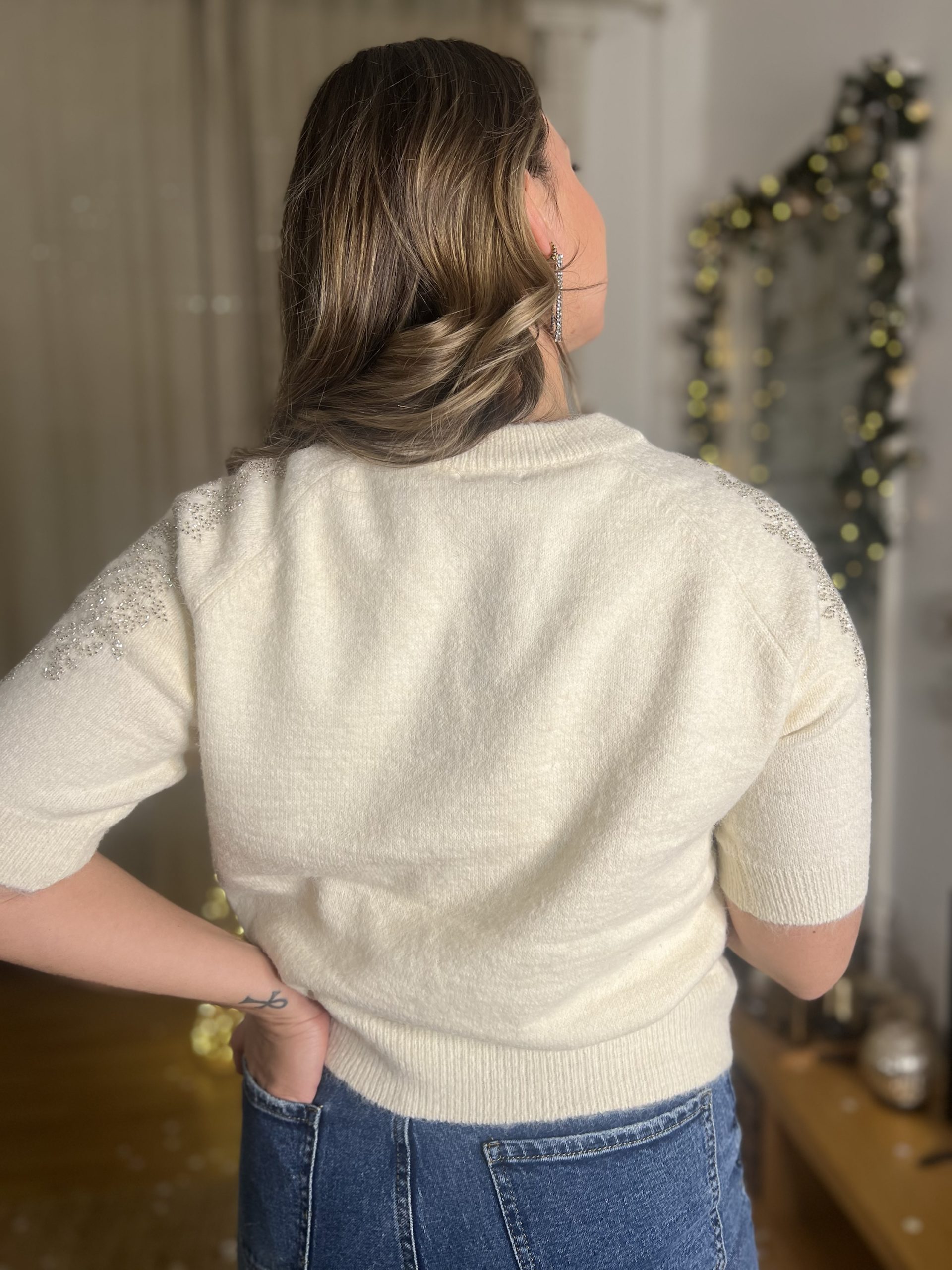 Le joli pull Louise, est un pull blanc cassé orné de strass sur tout les bras ! Il est CANON !