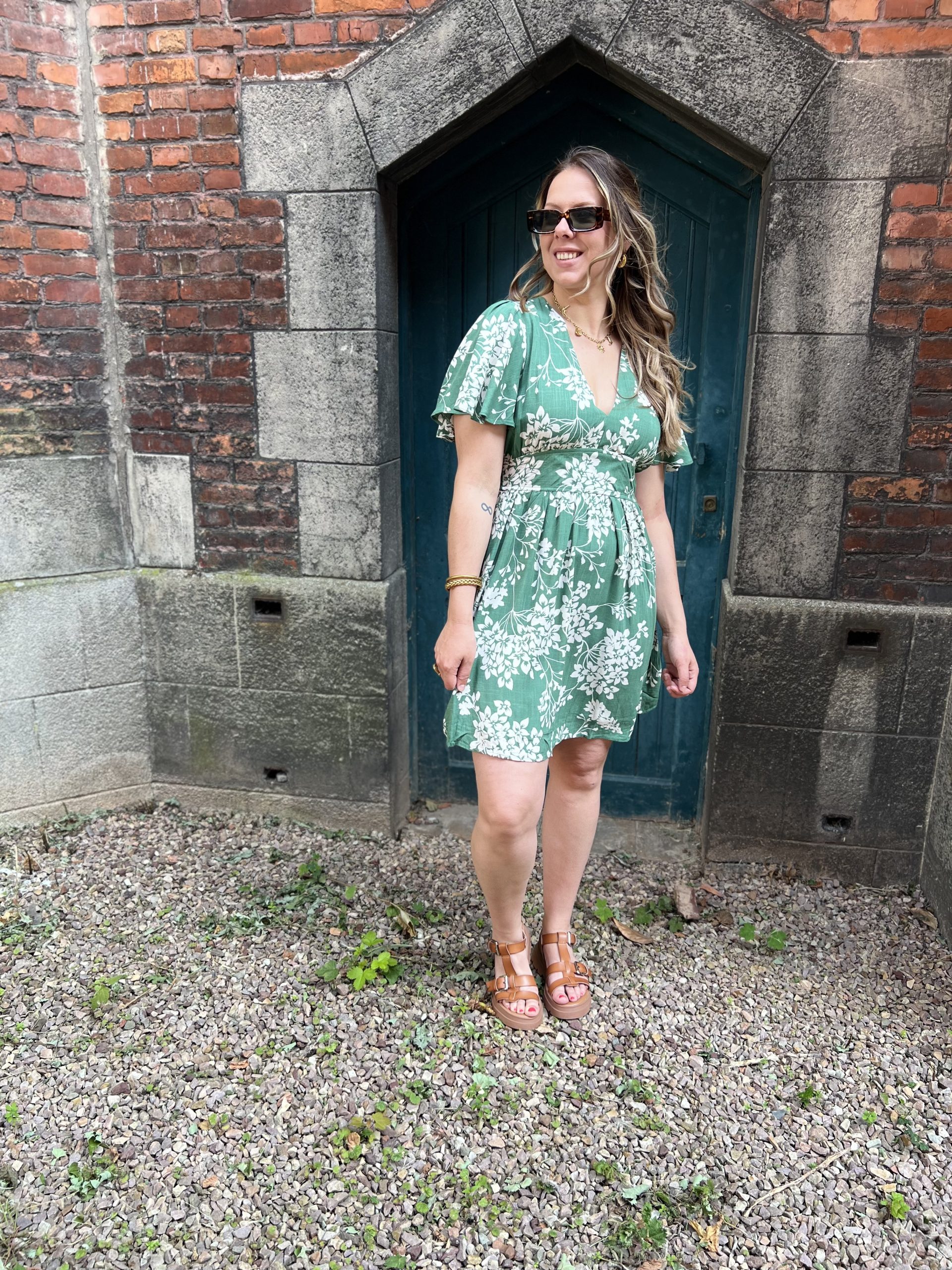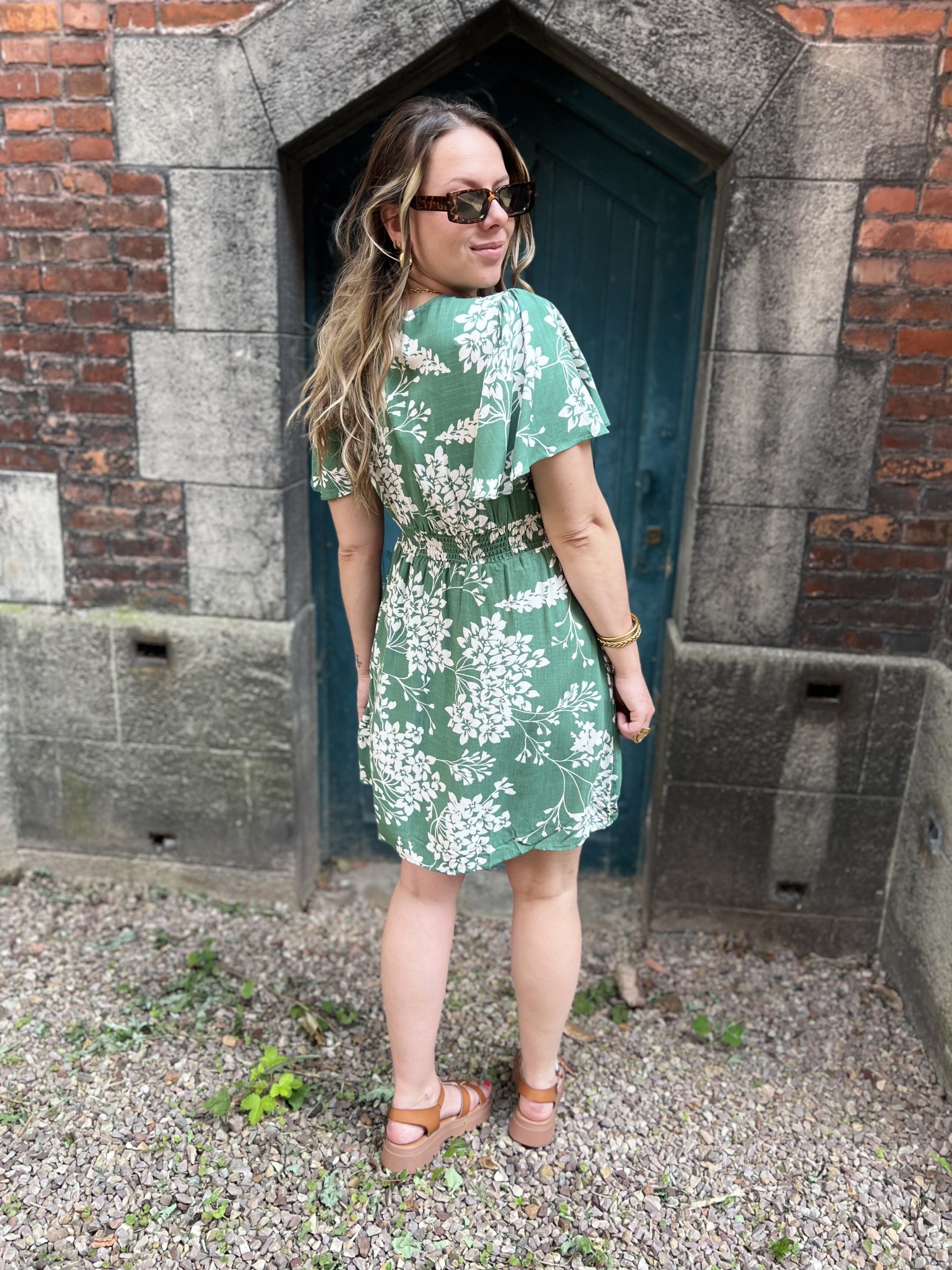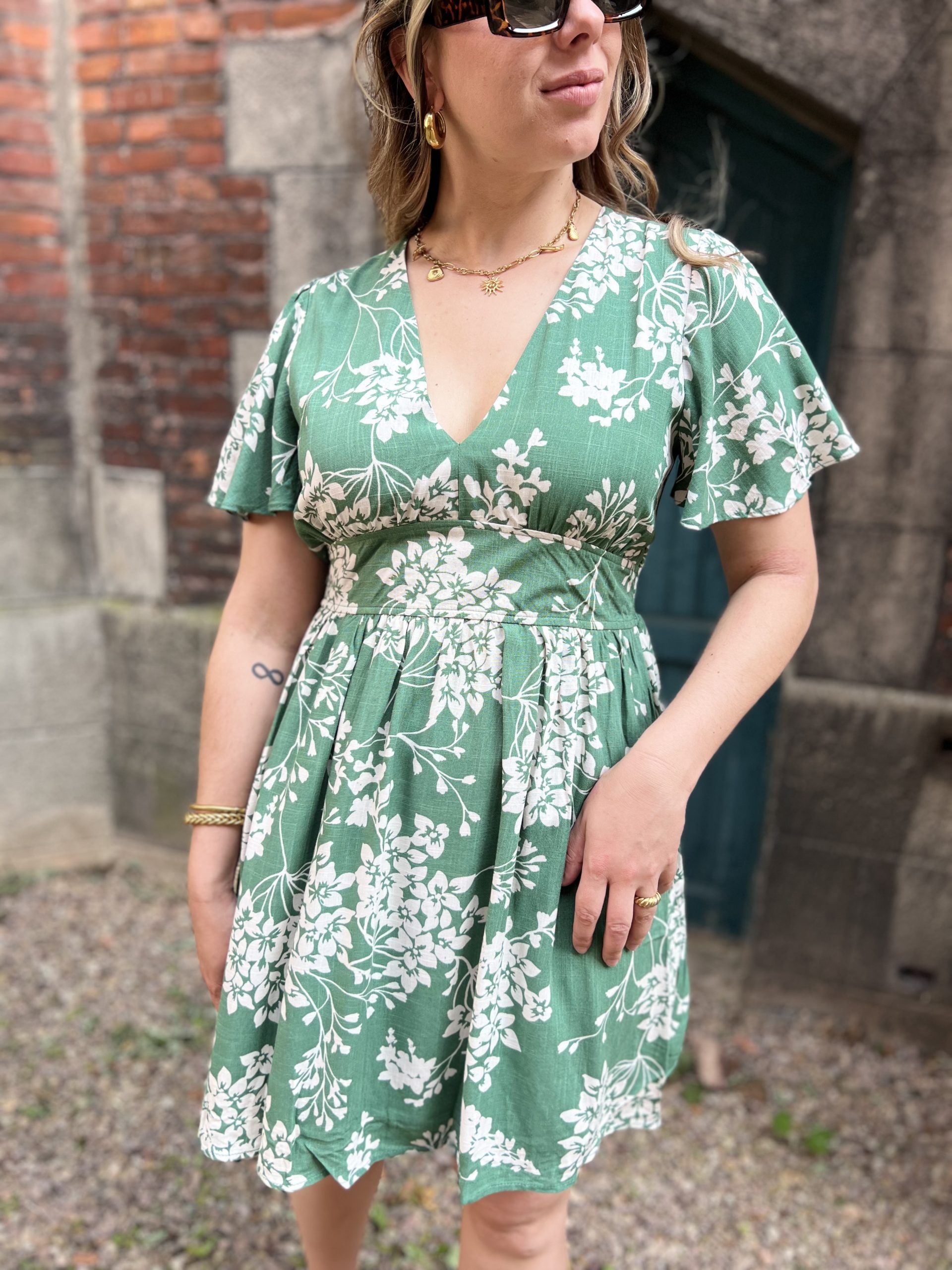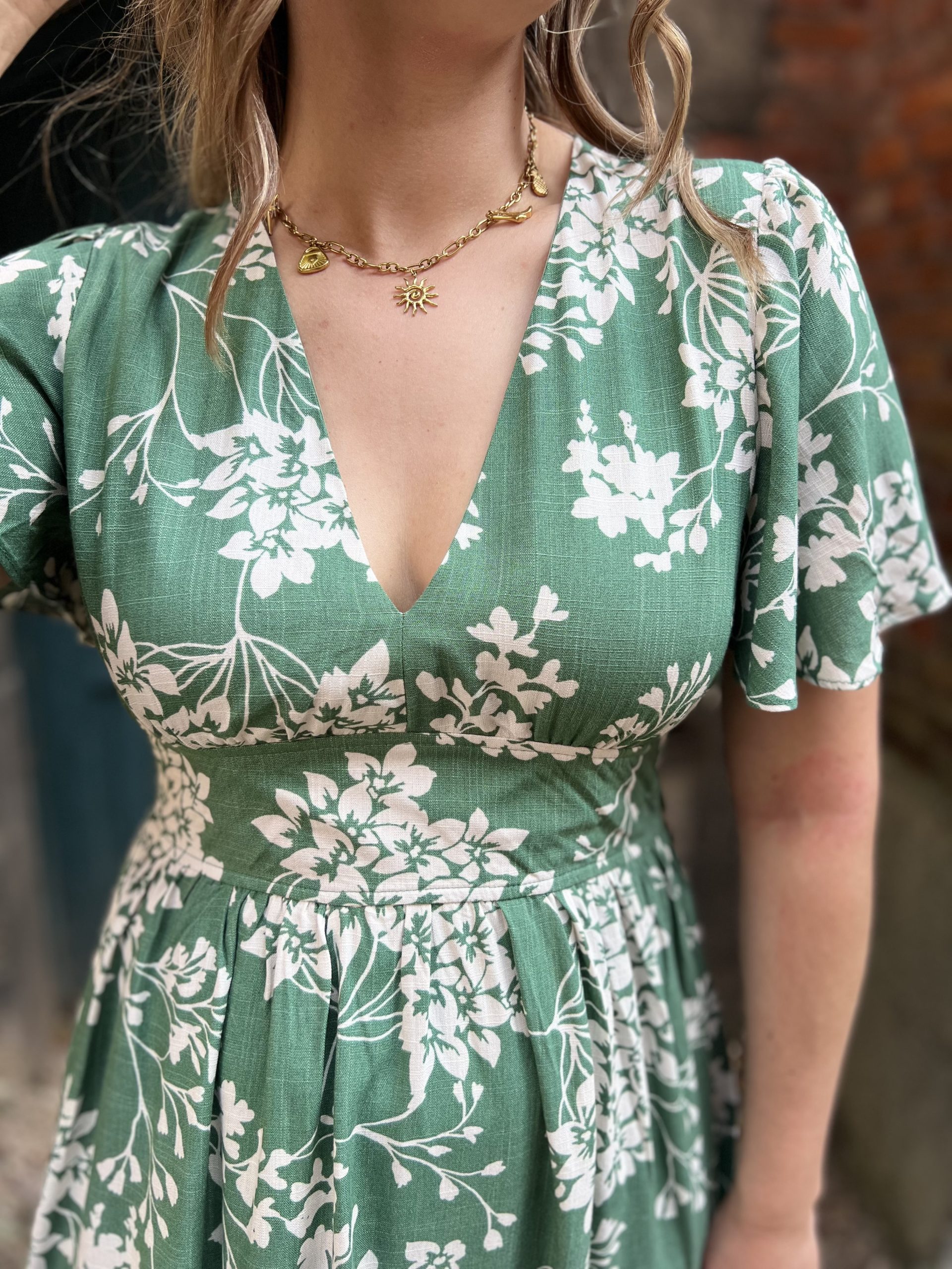 La robe Kelly est une robe courte verte avec des motifs écrus  !