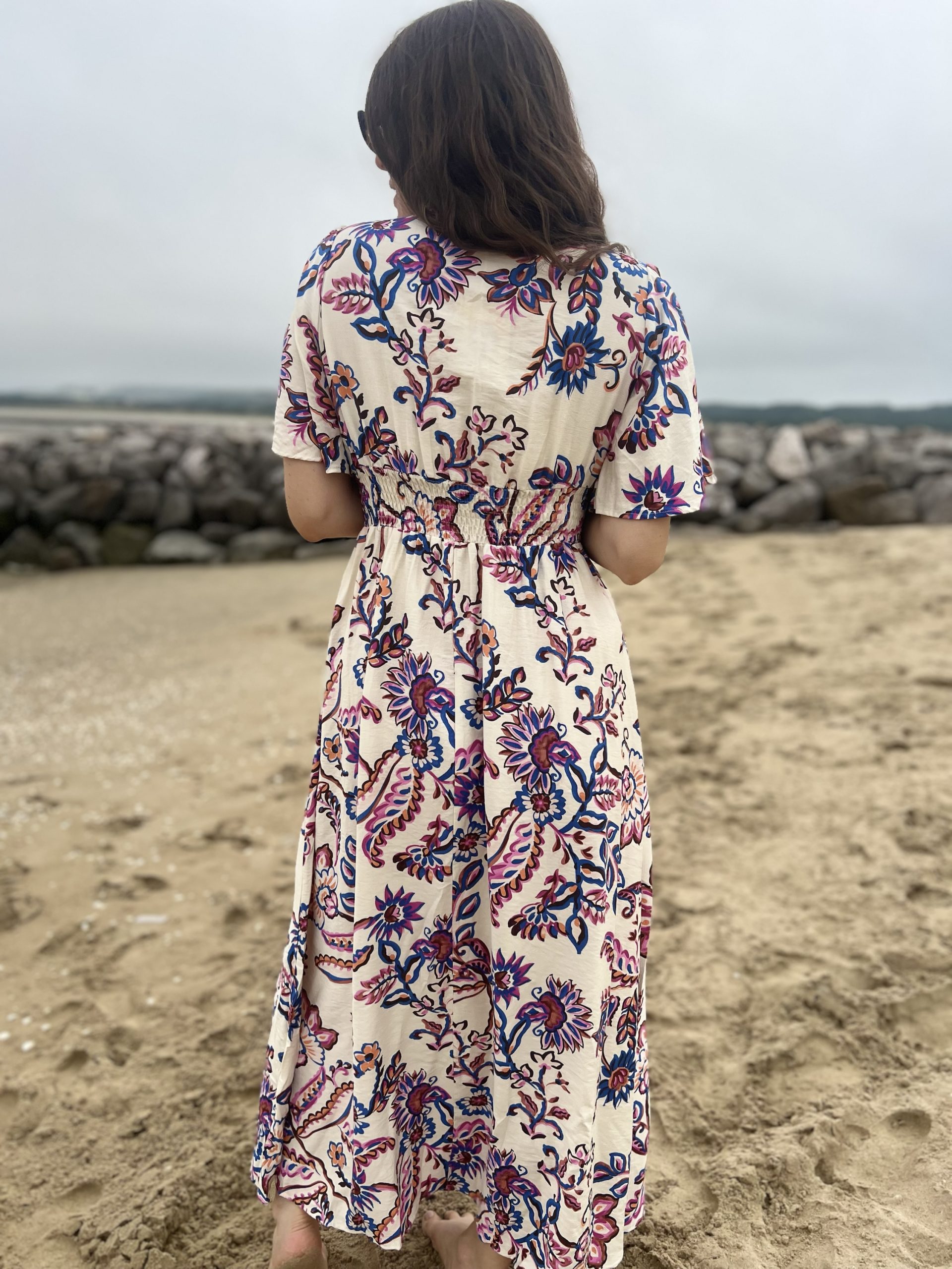 La Robe Victoria Bis est une magnifique robe longue avec des motifs dans les tons violet et bleu !