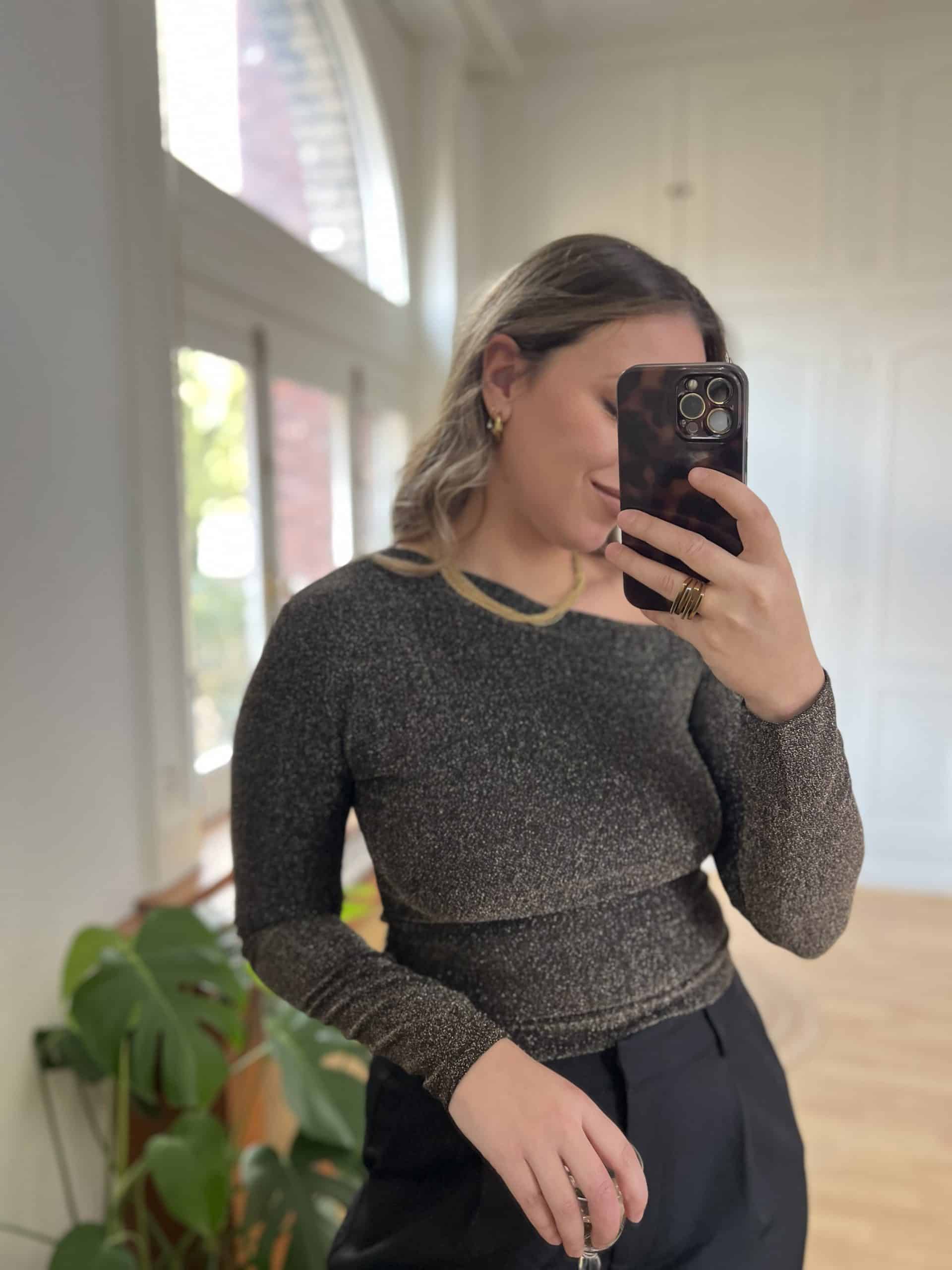 Le top Lily est un top moulant doré avec une encolure asymetrique